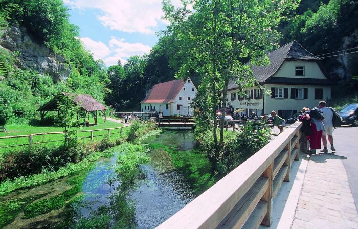 Im malerischen Hof der ehemaligen Klosteranlage Offenhausen entspringt die Große Lauter in einem eingefassten Karstquelltopf. Sie windet sich in Ihrem natürlichen Flussbett auf über 40 km Länge entlang von Wacholderheiden, Höhlen, Wäldern, Felsen, malerischen Dörfern und Burgruinen bis hin zu ihrer Mündung in die Donau.